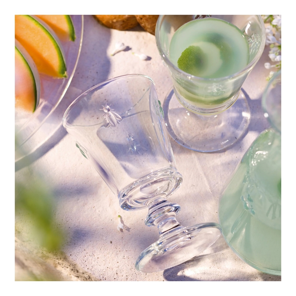 Copa degustación 355ml fabricada en vidrio prensado color transparente, decorada con cuatro abejas. Con relieve de la clásica abeja napoleónica, la copa de degustación luce líneas limpias y cuadradas sobre un tallo robusto.